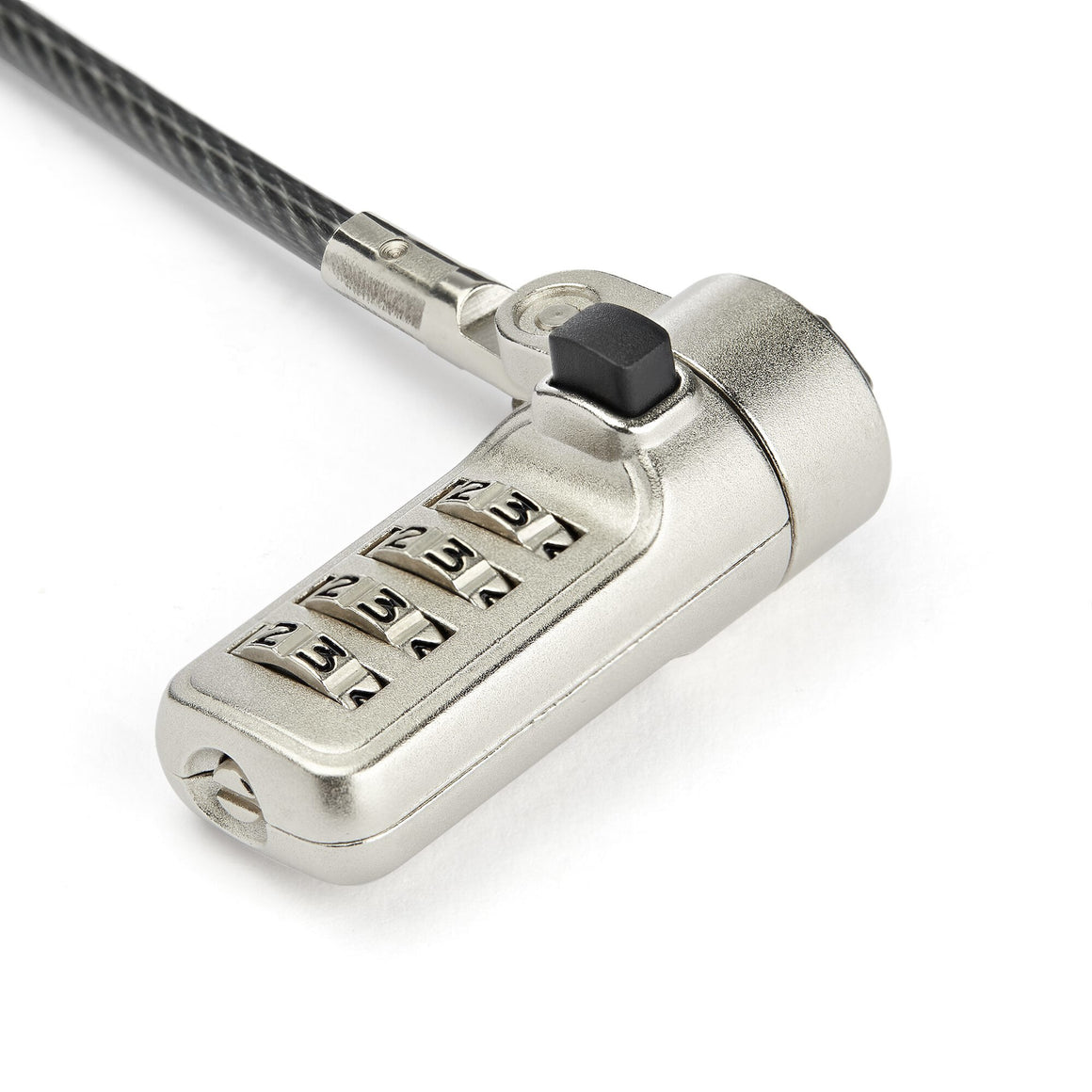 Ideal for use at the office or when travelling, the portable combination lock features a strong vinyl-coated steel cable (4.4 mm diameter). To secure your device in different work spaces, the flexible steel cable bends easily to loop around a stationary post or object.