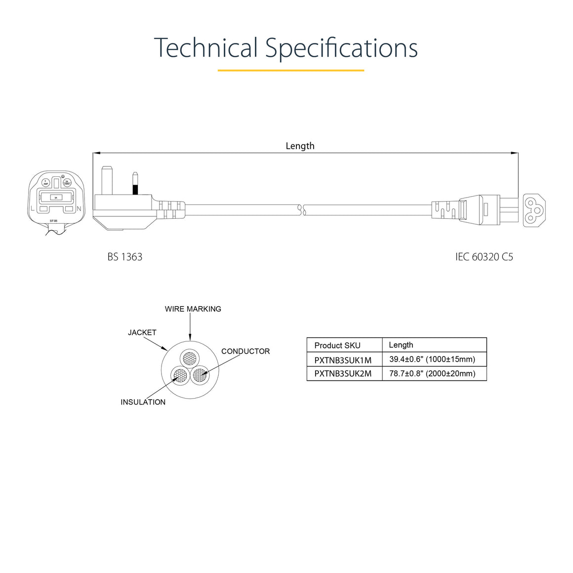The PXTNB3SUK2M 2m Laptop Power Cord features one BS 1363 (Type G) UK power plug and one 3-prong C5 connector, making it a suitable replacement cable for an HP, Toshiba or other compatible laptop equipped with a cloverleaf/C5 power connection.