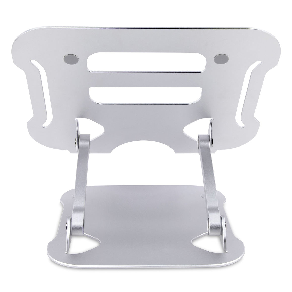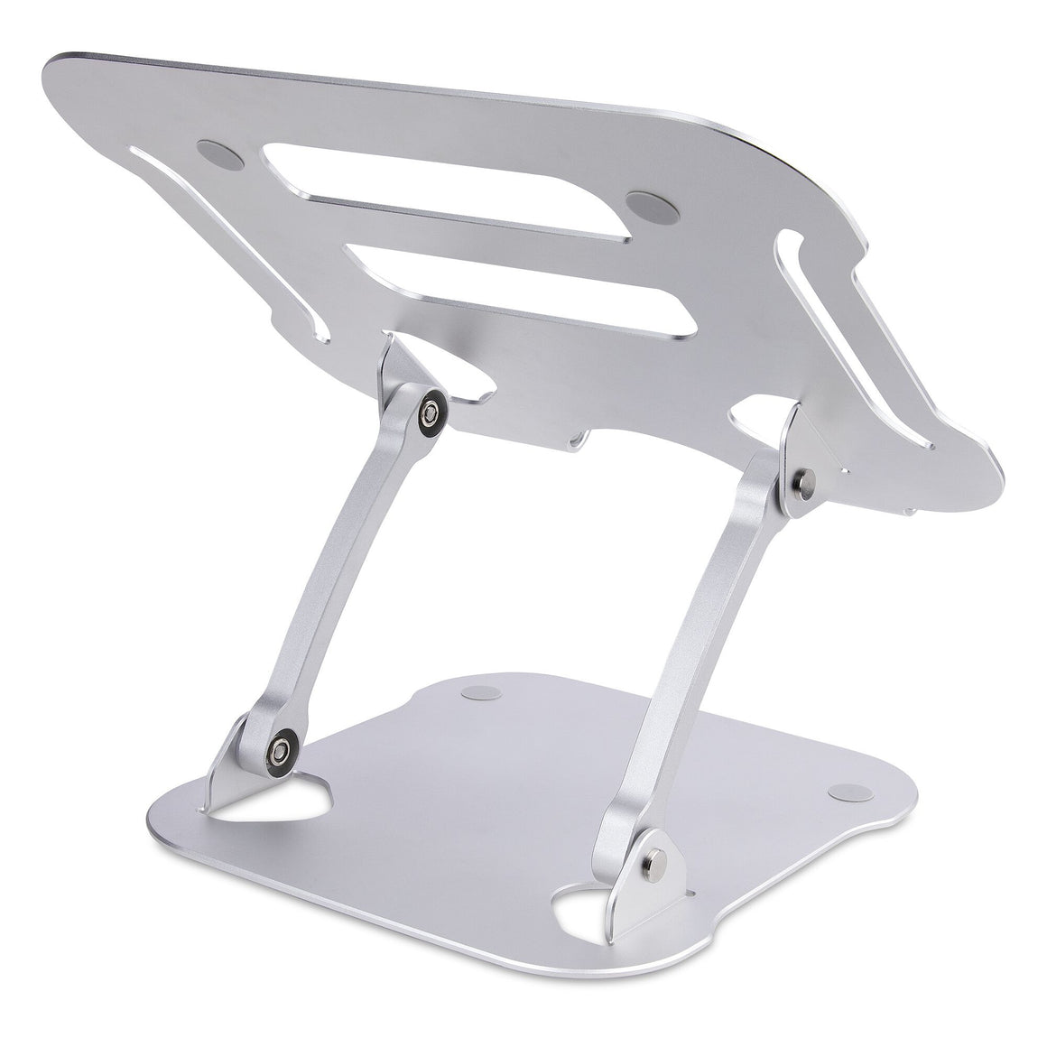The laptop riser features a silver anodized finish with aluminum construction to ensure durability and sturdiness. The vented surface area is elevated to promote passive cooling and airflow. The space underneath the laptop platform can be used to store a keyboard, mouse, and/or other accessories and peripherals when they are not in use.