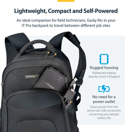 This compact crash cart adapter lets you connect to a headless device using only a laptop, eliminating the need to lug around an awkward, traditional server room crash cart. With optimal portability in mind for your mobile administration or repairs, this pocket-sized adapter features a small footprint and lightweight design that easily fits inside your laptop bag.