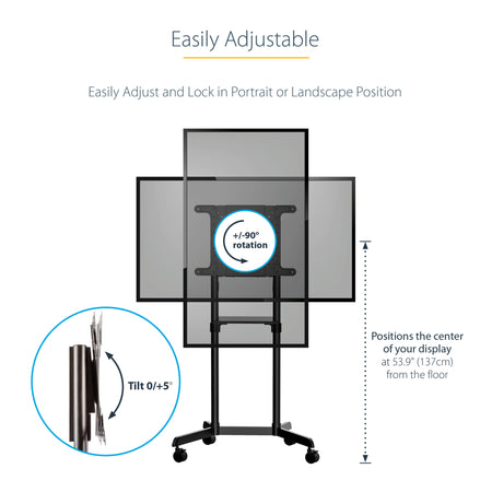 This rolling tv stand with a mount will adapt to the different setups that you may encounter in your office space. You can tilt the viewing angle within 0/+5° to best suit your environments and reduce glare and rotate your display -90°/+90° for portrait or landscape orientations.