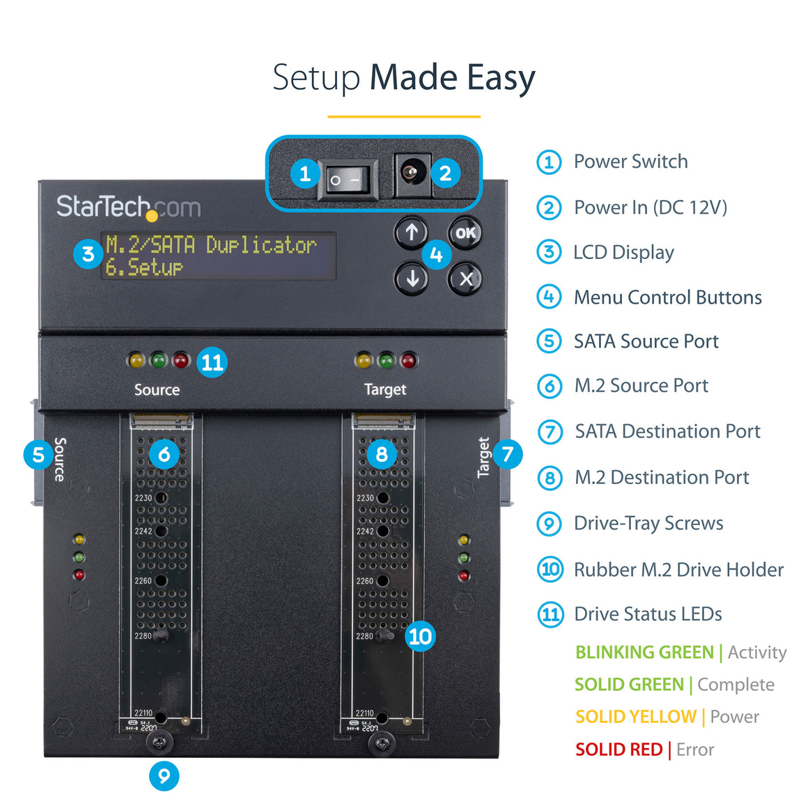 Featuring an intuitive button-operated interface, and full on-screen display (OSD) for increased manageability, this drive duplicator and cloner is easy to operate. To monitor and observe your duplication and erasing processes the device features LED indicators for Power/Activity, Status and Errors, and the OSD Menu options include Error Reporting, and Presenting Drive Info.