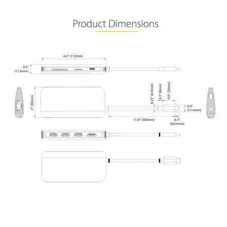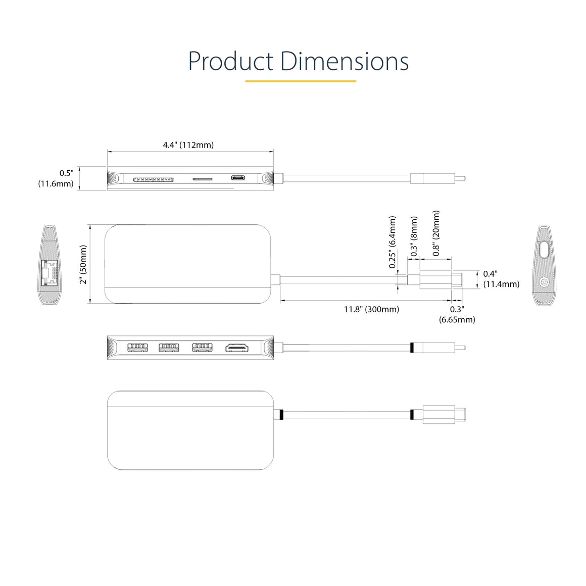This USB-C™ Multiport Adapter with DP 1.4 Alt Mode supports 4K 60Hz HDMI® (HDR) and turns your MacBook, Dell XPS, or other USB-C laptop or tablet into a workstation, anywhere you go. The USB Type-C™ Multiport Adapter features a 4K HDMI video output, three USB 3.2 Gen 1 Type-A (5Gbps) ports, SD and MicroSD card readers and a Gigabit Ethernet port, all through one connection to your laptop's USB-C, USB4, or Thunderbolt 3/4™ port. Plus, it offers advanced charging and flexibility through a shared USB-C Power Delivery 3.0 and Data port which can be used to connect peripherals, with USB 2.0 transfer speeds (480Mbps), when a power source is not connected. The Multiport Adapter features an extra-long attached 12-inch (30 cm) host cable - for an extended reach, to offer more set up flexibility.