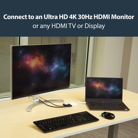 For maximum productivity, connect your USB-C or Thunderbolt 3 laptop to a 4K 30Hz monitor, using this USB-C to 4K HDMI adapter. You can also connect to an HDMI projector or TV in a boardroom or other meeting space, to deliver presentations on a shared screen.