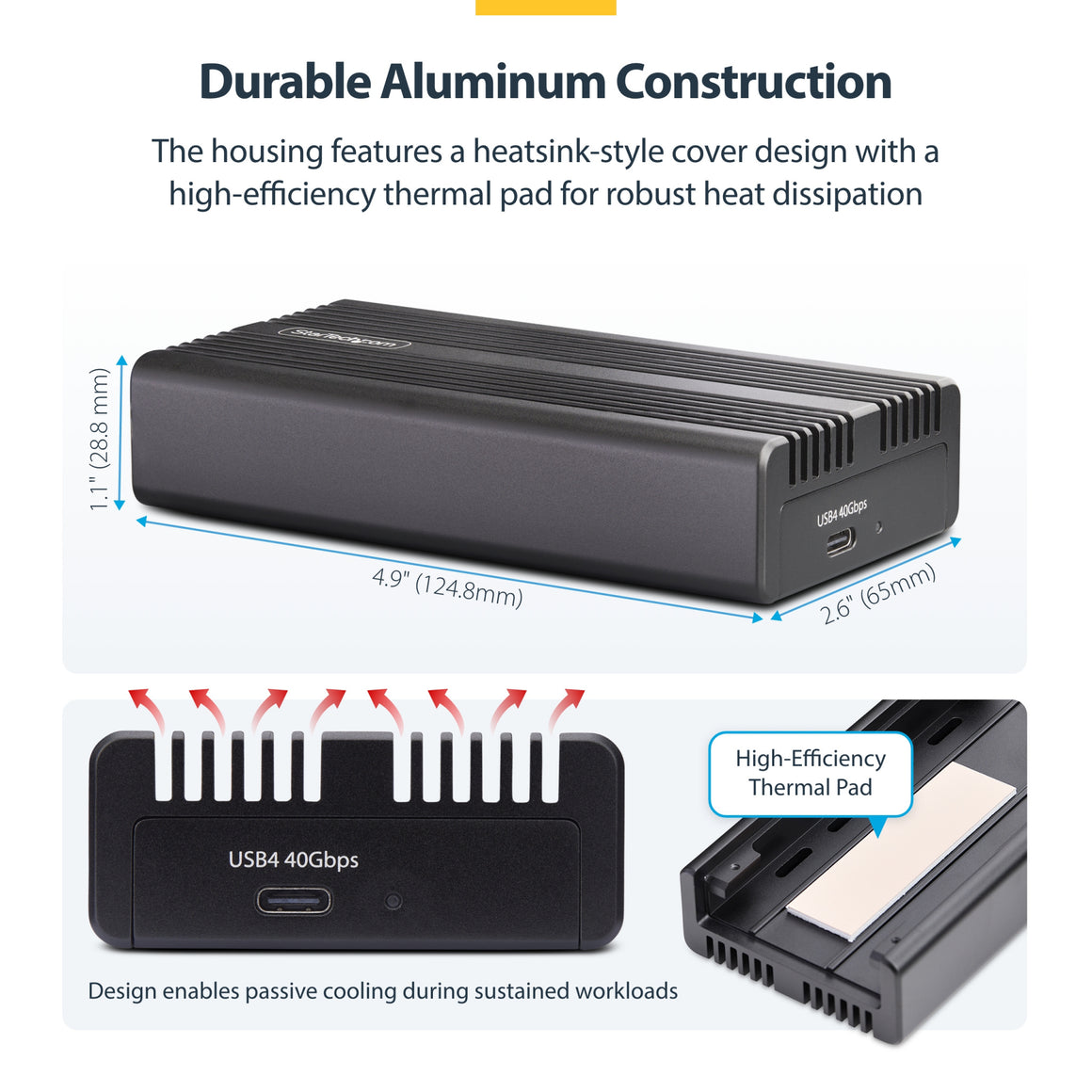 Built for current and next-gen storage, this USB4 enclosure connects M-Key or B+M Key M.2 NVMe SSDs (2230/2242/2260/2280) to USB4, Thunderbolt 5/4/3, or USB 3.2 hosts. It supports PCIe Gen 4x4 NVMe drives and offers native, driverless compatibility with Windows, macOS, and Linux. Seamless interoperability with USB-C and Thunderbolt systems makes it ideal for fast backups and high-volume data transfers.