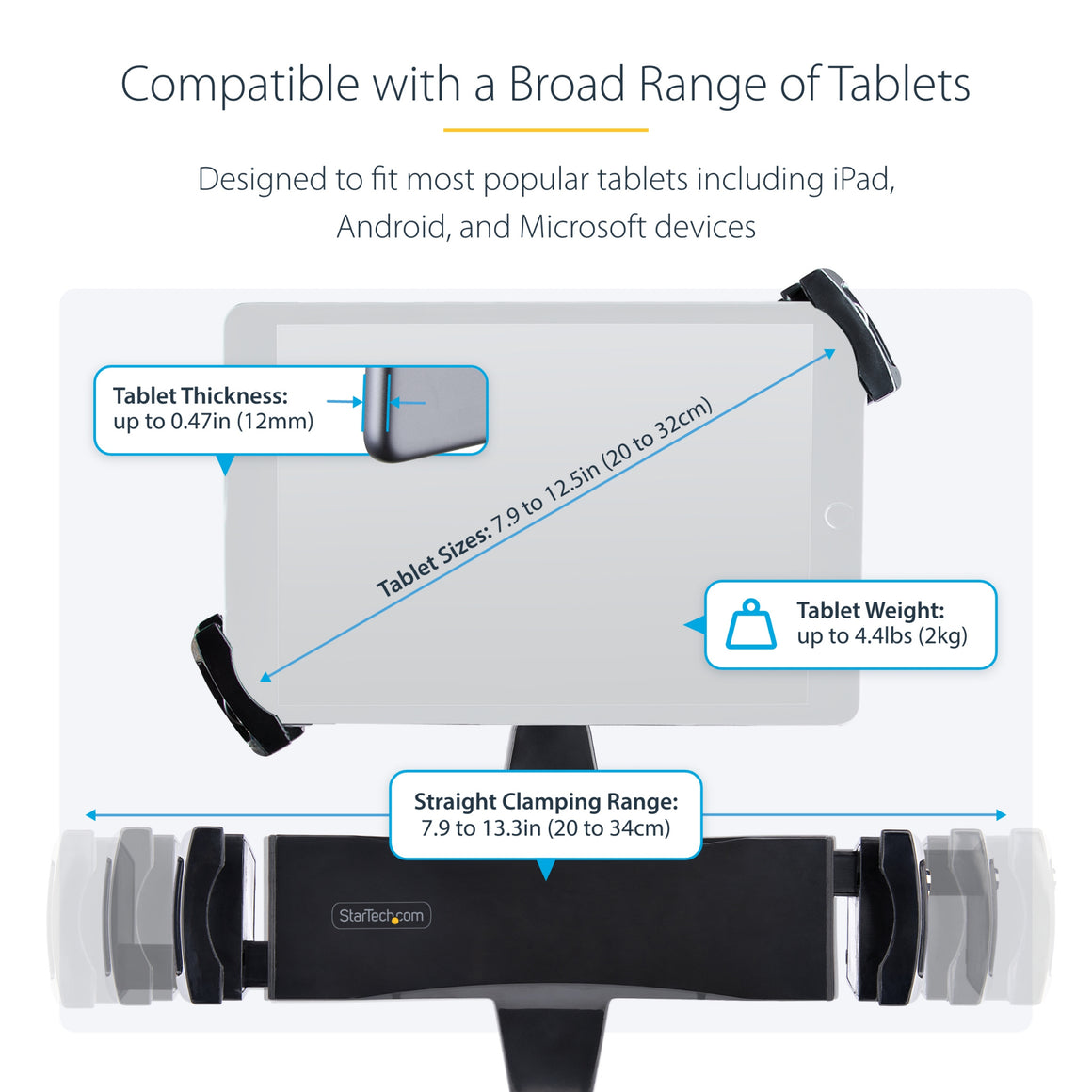 Attach a tablet to a VESA-compatible monitor arm, using this VESA mount adapter for tablets. The adapter is easy to install into your monitor arm or stand, and it supports most tablets of different brands with display sizes between 7.9 to 12.5 in. The spring-loaded clamp offers range of 7.9 to 13.3 in (200 to 340 mm) and can hold tablets up to 0.47 in (12 mm) thick and up to 4.4 lb (2 kg).