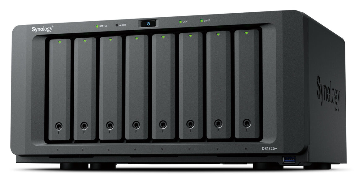 The DS1825+ features built-in 2.5GbE networking and supports both SATA SSDs and HDDs in 2.5"/3.5" internal bays, as well as M.2 NVMe drives via M.2 slots for use as cache.1,6 Its support for expansion cards allows configuration flexibility, supporting faster networking of up to 25GbE.4