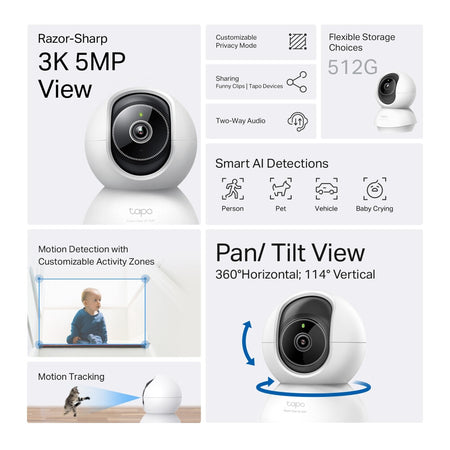 Smart AI identifies people, pets, and vehicles while recognizing a baby crying and other sounds, notifying users as needed.