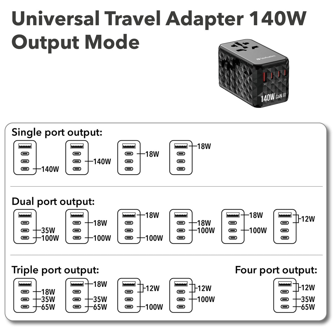 The compact and powerful Verbatim GaN III Universal Travel Adapter allows five devices to be charged simultaneously through the AC power socket and the three USB-C and single USB-A ports.