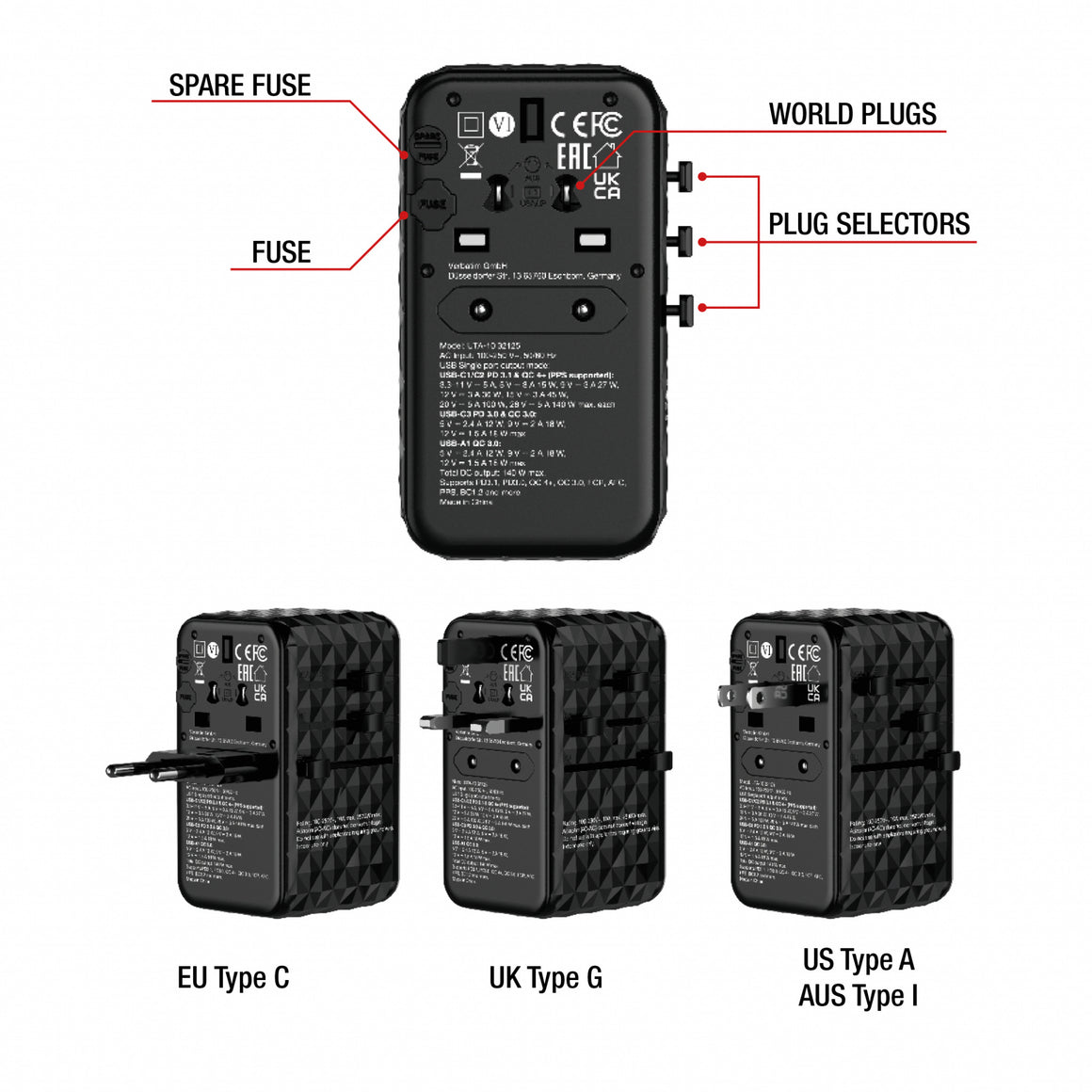 The Verbatim GaN III Universal Travel Adapter can be used in more than 180 countries – take it everywhere with you and never be out of power. This world-to-world multi plug will allow you to connect to any local power supply around the world and recharge your power-hungry devices, like laptops, smartphones, Bluetooth speakers, tablets, power banks, and more. Just push the sliders on the side of the multi plug to reveal the three most common international plugs - EU, UK, and US - and rotate the pins for sockets in Australia or China.
