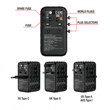 Housed in an attractive black 3D design, the Universal Adapter is made with high quality fireproof polycarbonate material and is certified by CE, UKCA, FCC and ROHS.