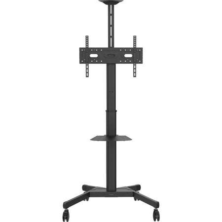 The cart includes one shelf for a video conference camera above the display and a larger one below for laptops and other equipment. Both shelves are height adjustable.