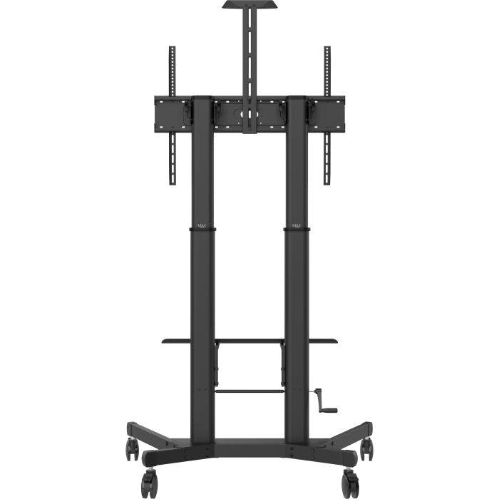 The 4-inch (100 mm) casters ensure the cart glides easily over thick carpet and minimizes vibration to sensitive electronic equipment. All four wheels can be locked.